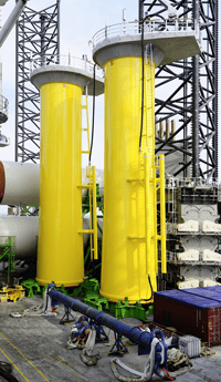 Opbevaring af de mere end 600 tons tunge stålfundamenter til havmølleparken.