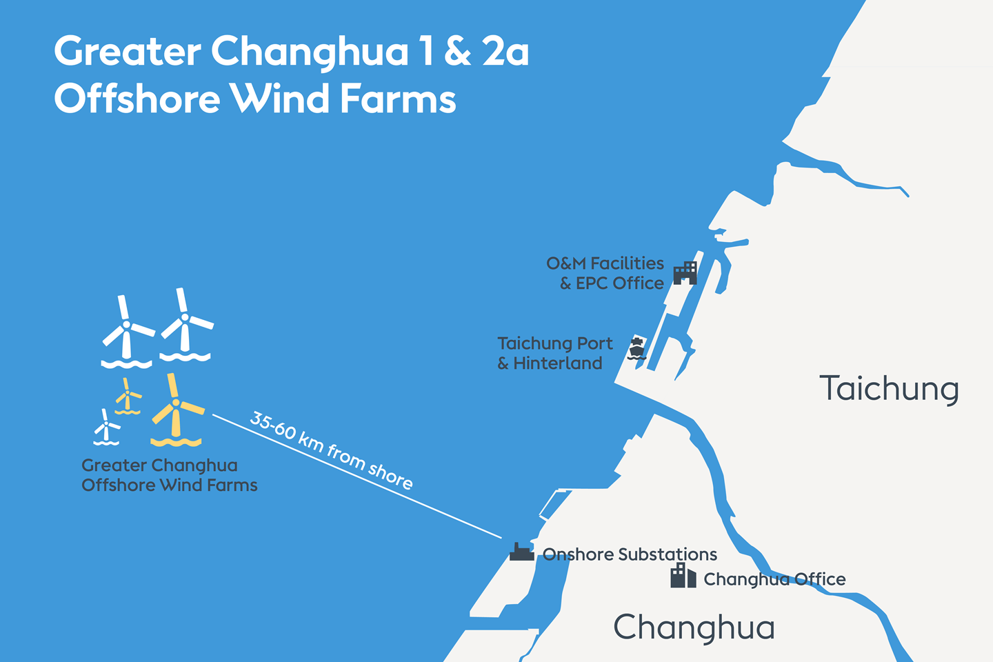 Taiwans første store havvindmøllepark, der ligger 35-60 km ud for Changhua Countys kyst, skal efter planen stå færdig i 2022, hvorefter den kan levere ren energi til en million taiwanske husstande.