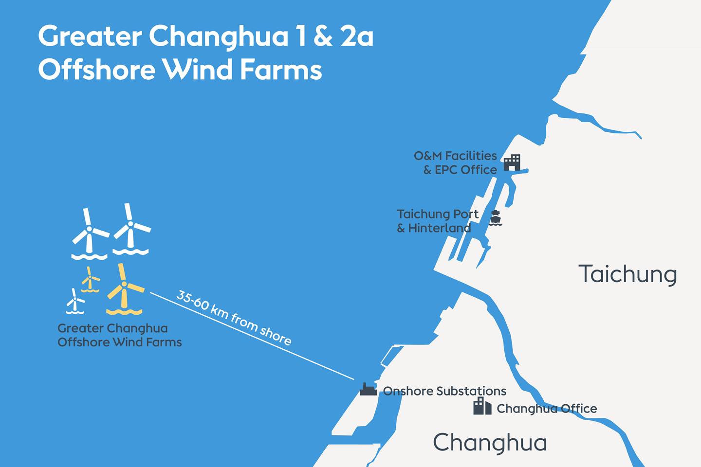 Located 35-60 km off the coast of Changhua County, the first large-scale and farshore offshore wind farms in Taiwan is scheduled to be finalized by 2022 and will provide clean energy to one million households.